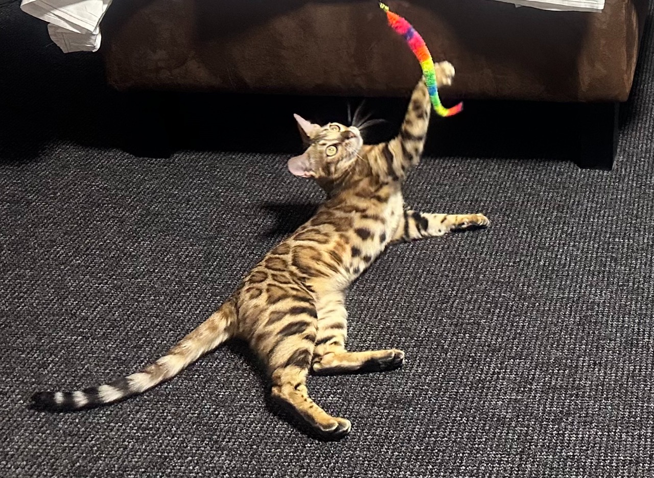 V našem plemeni soutěžilo celkem 11 nádherných Bengálek, byla tu k vidění koťátka po našem Maxíkovi z chovatelské stanice BeBe pets, sněžné a hnědé a musím uznat, že letos byly všechny Bengálky opravdu překrásné, bylo na co se dívat, vítězkou se v sobotu stala naše milovaná kočička Caramelka, je to moje chlouba, výsledek mého letitého šlechtění, je velice divoká v typu - pravá šelma, drobná, dlouhá a štíhlá, ale osvalená, s krásnou světle hnědou barvou a nádhernou kresbou, mám obrovskou radost, že se divákům líbila. V neděli jsme již Caramelku nechali odpočívat a na podium šli do soutěže naši dva kluci, tmavější kocourek Daemonek, koťátko - s atletickou postavou, krásnými tmavými skvrnami a nádhernou hlavičkou a mladý sebevědomý hnědý kocourek Zorro, ten byl po celý víkend ve skvělé formě i náladě, výstavu i obdiv návštěvníků si očividně užíval, procházel se na kšírkách a právem se tento den stal vítězem plemene právě on. Ráda bych tímto vyjádřila poděkování novým rodinám našich koťátek za jejich skvělé předvedení a úžasnou prezentaci plemene! Byla pro mě neskutečná radost se na Vás dívat jak své miláčky milujete a děláte pro ně vše - co může být pro chovatele víc...